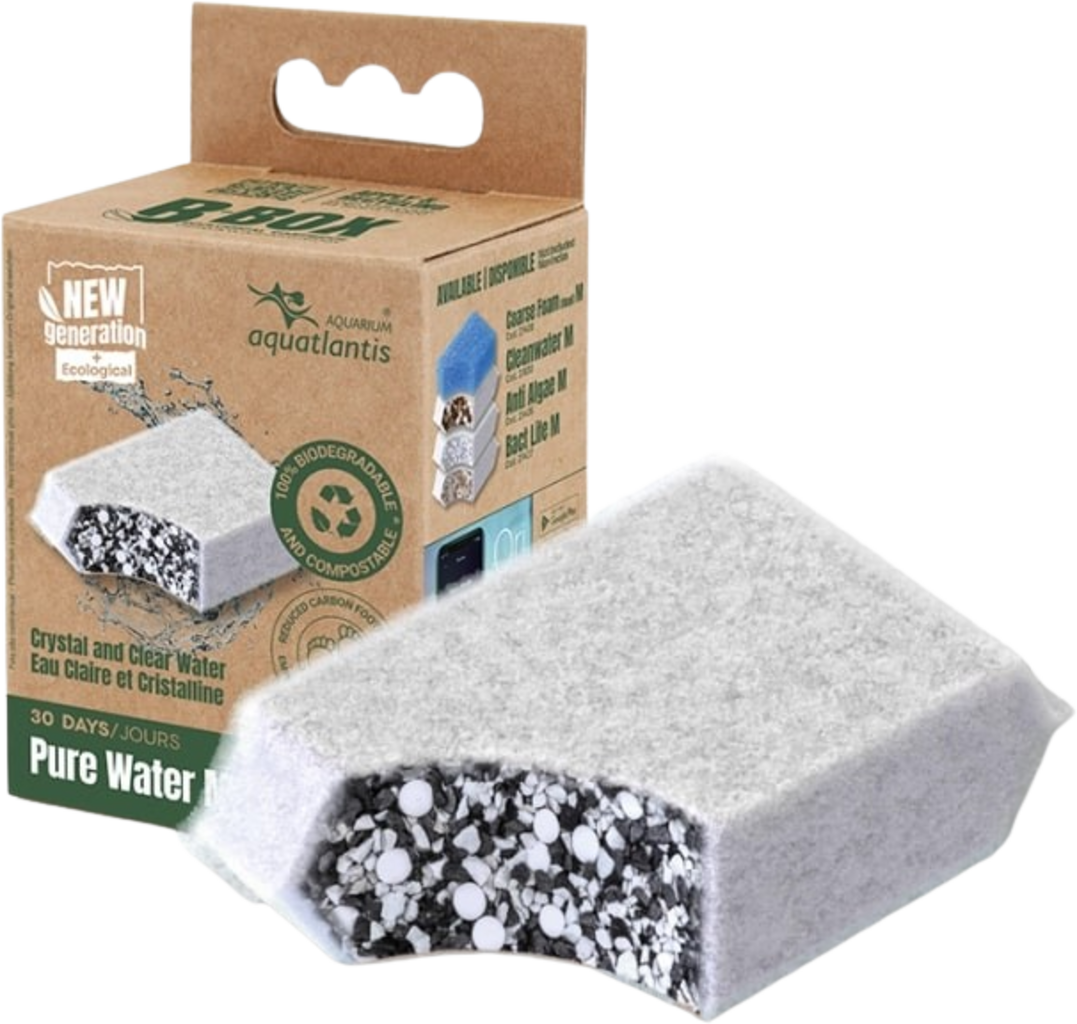 Het B-Box Pure Water filtermedium voorkomt en verwijdert kleurstoffen, geuren, chloor, chlooramines en metalen en zorgt zo voor kristalhelder water in je aquarium! Bovendien is het filtermedium 100% organisch en kan het na gebruik in het aquarium hergebruikt worden in plantensubstraten.