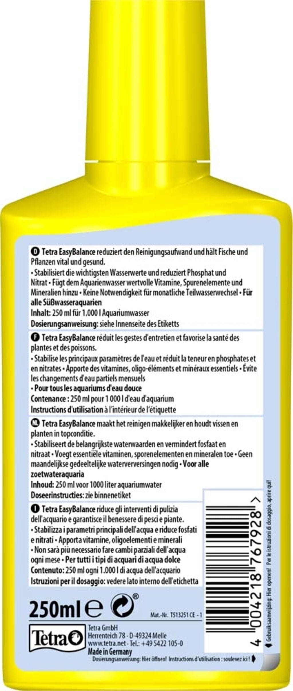 Tetra EasyBlaance vermindert de reinigingsinspanning en houdt vissen en planten in vorm. De unieke combinatie van actieve ingrediënten zorgt voor meerdere maanden gebalanceerd water en verlengt de periode tot de volgende waterverversing. De verbeterde formule bevat een geoptimaliseerde mix van mineralen. Tetra EasyBalance vereenvoudigt het aquariumonderhoud en optimaliseert de waterkwaliteit. De belangrijkste waterwaarden zoals pH en KH worden tot wel 6 maanden gestabiliseerd. Nitraat en fosfaat worden van nature gereduceerd. Tetra EasyBalance voegt waardevolle vitamines en mineralen toe die belangrijk zijn voor gezonde vissen en planten. Het verbruik van kraanwater wordt geminimaliseerd en de maandelijkse noodzaak voor gedeeltelijke waterverversing wordt geëlimineerd.