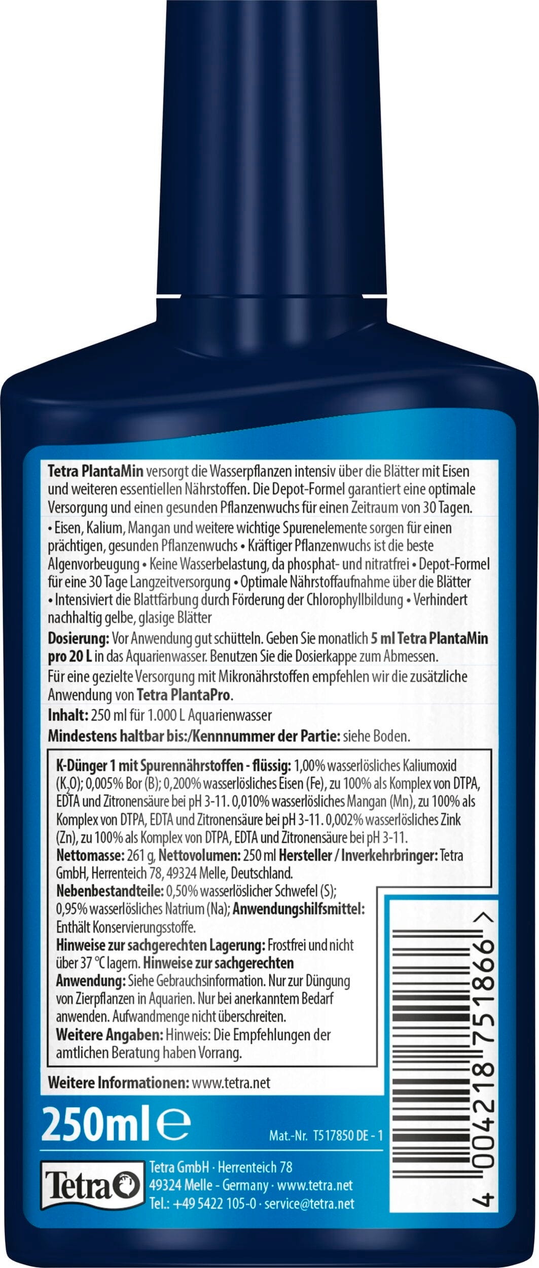 De voedingsstoffen worden zeer efficiënt direct via de bladeren opgenomen, wat de vorming van chlorofyl ondersteunt en zo zorgt voor diepgroene, glanzende bladeren. Een speciaal pluspunt voor je biologisch evenwicht: Tetra PlantaMin is volledig vrij van fosfaten en nitraten, waardoor het water niet onnodig wordt vervuild. Door een krachtige plantengroei te bevorderen, ontneem je algen op natuurlijke wijze hun levensbasis en zorg je dus voor een blijvend mooi en helder aquarium!